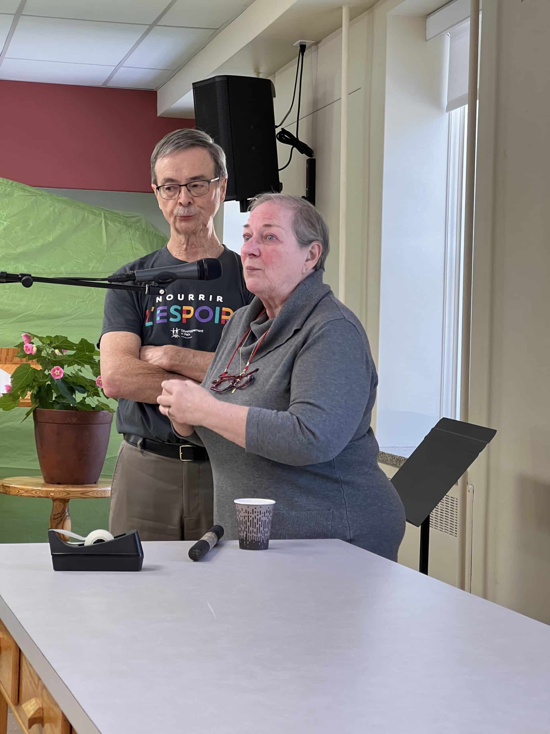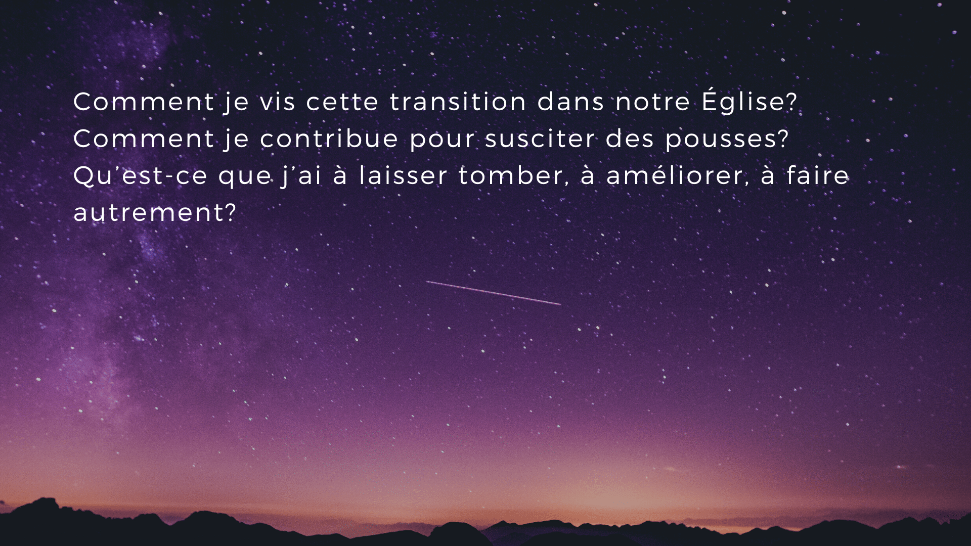 Il était ensuite temps d’entendre le témoignage de Jean-Denis Lampron et Diane Labranche sur leur expérience de transition en entreprise. Comment faire des deuils et laisser la place? Accueil, bienveillance, miséricorde, ouverture. Nous avons des deuils à faire par rapport à la direction. On est là pour nous ou pour la mission? Cela a permis d’introduire un temps de réflexion sur la transition en Église, sur ma contribution aux nouvelles pousses.
