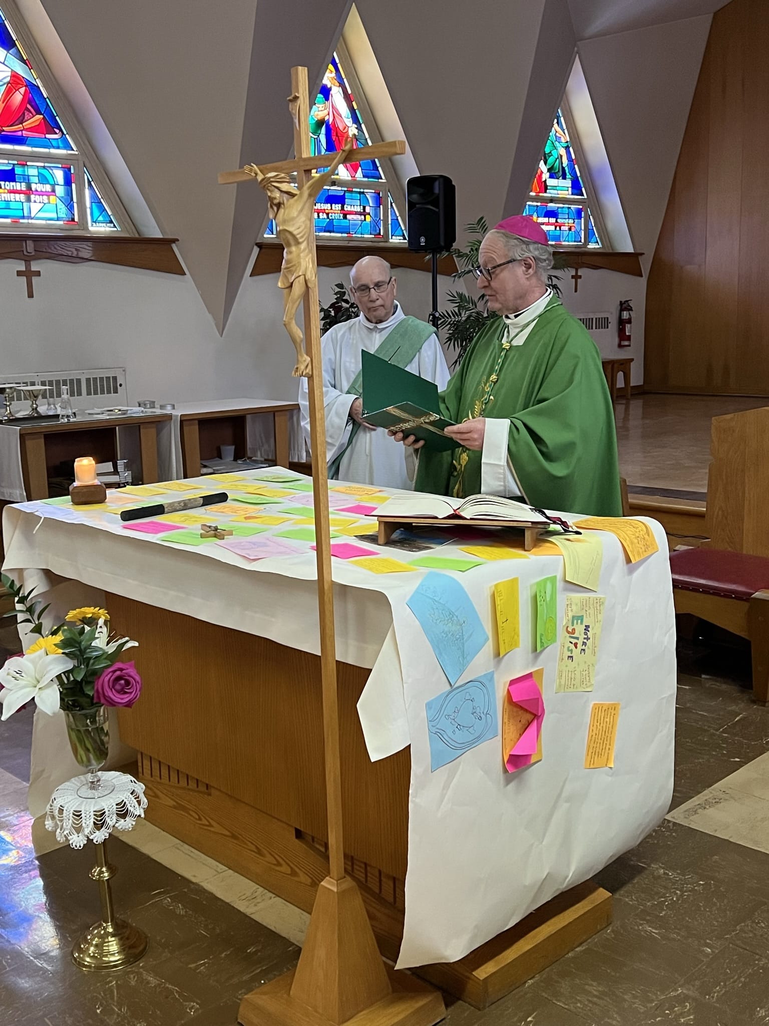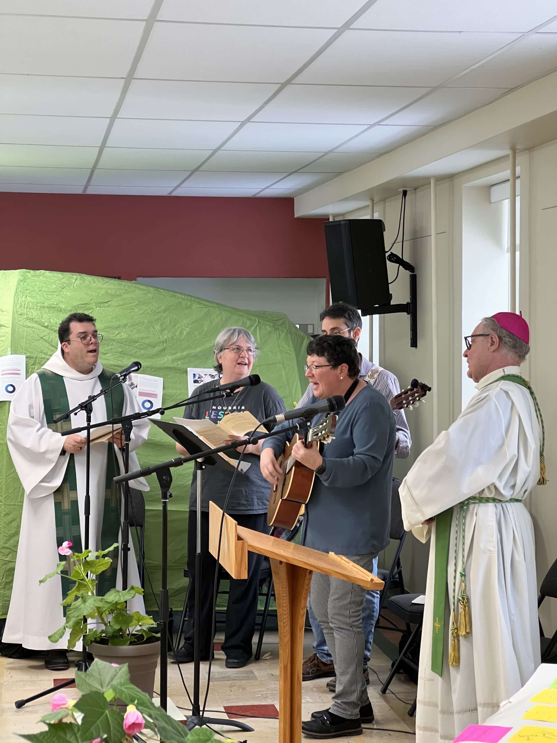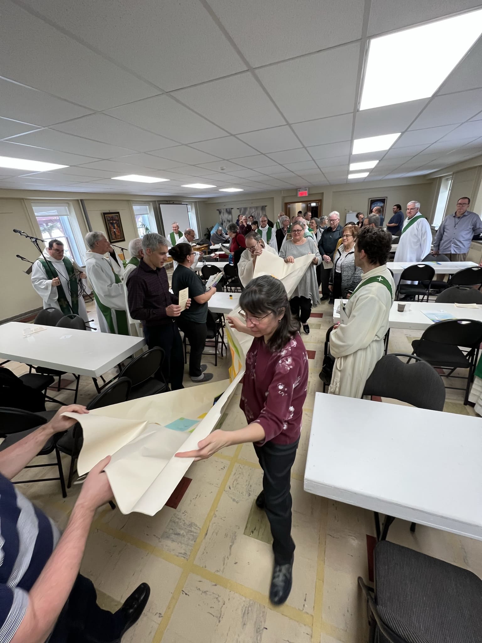 En grand groupe, nous avons partagé sur ce qui nous a remués. Puis nous avons participé à créer une murale (une grande banderole de papier déroulée sur la table. Un temps personnel est donné à chacun pour dessiner ou écrire son rêve pour notre Église sur une feuille en forme de casse-tête. Comme personne exerçant un ministère au cœur de l’Église de Nicolet, qu’est-ce que je souhaite semer avec les autres pour l’avenir? Chacune et chacun est allé coller son rêve d’Église sur la murale. Cette murale a été amenée en procession dans la chapelle pour l’eucharistie en après-midi et a servi de nappe d’autel.
