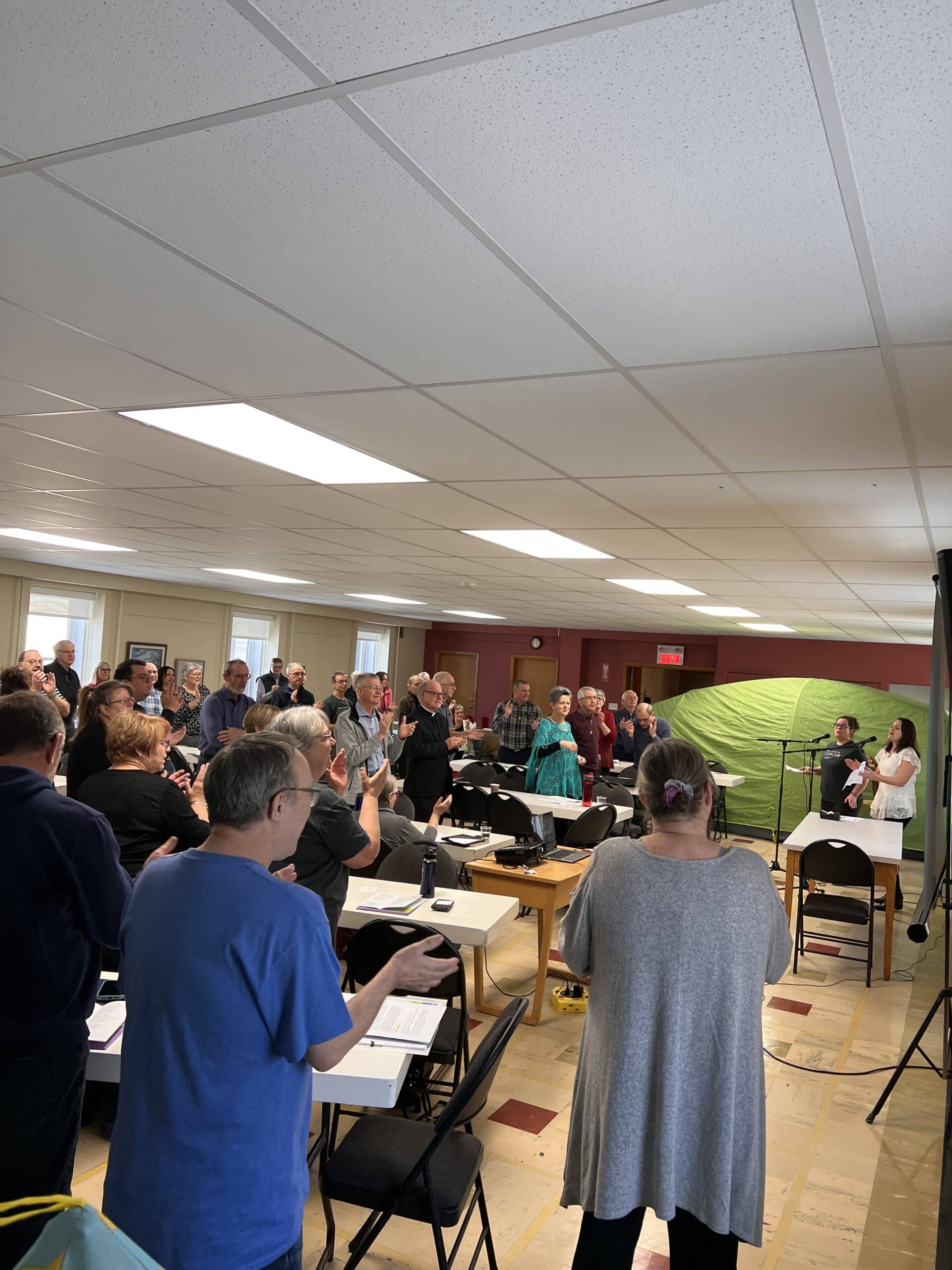En arrivant le mardi, il y avait présentation des objectifs de la retraite : situer la retraite dans la visée diocésaine et notre désir d’être cette Église missionnaire et synodale puisque nous sommes en terre de mission. Trois mots pour cette retraite interministérielle : annoncer, fraterniser, témoigner. Un thème pour les deux journées : « Élargis l’espace de ta tente » (Is 54, 2). Ce lancement fut suivi d’un sketch : Une tente est installée dans un coin de la salle. La toile servant de toit à la tente n’est pas installée. À chaque coin, nous retrouvons une personne : un prêtre, un diacre et son épouse, une agente de pastorale et l’évêque. Chaque personne tire sur son coin en disant ce qui l’anime dans son ministère. Martyne, garde forestière, vient présenter les définitions de chacun des ministères à partir du livre « Le mot juste ». Les baptisés sont aussi définis et les nouveaux ministères sont évoqués. Le sketch se conclut par le travail ensemble : chacun installe son coin de la toile.