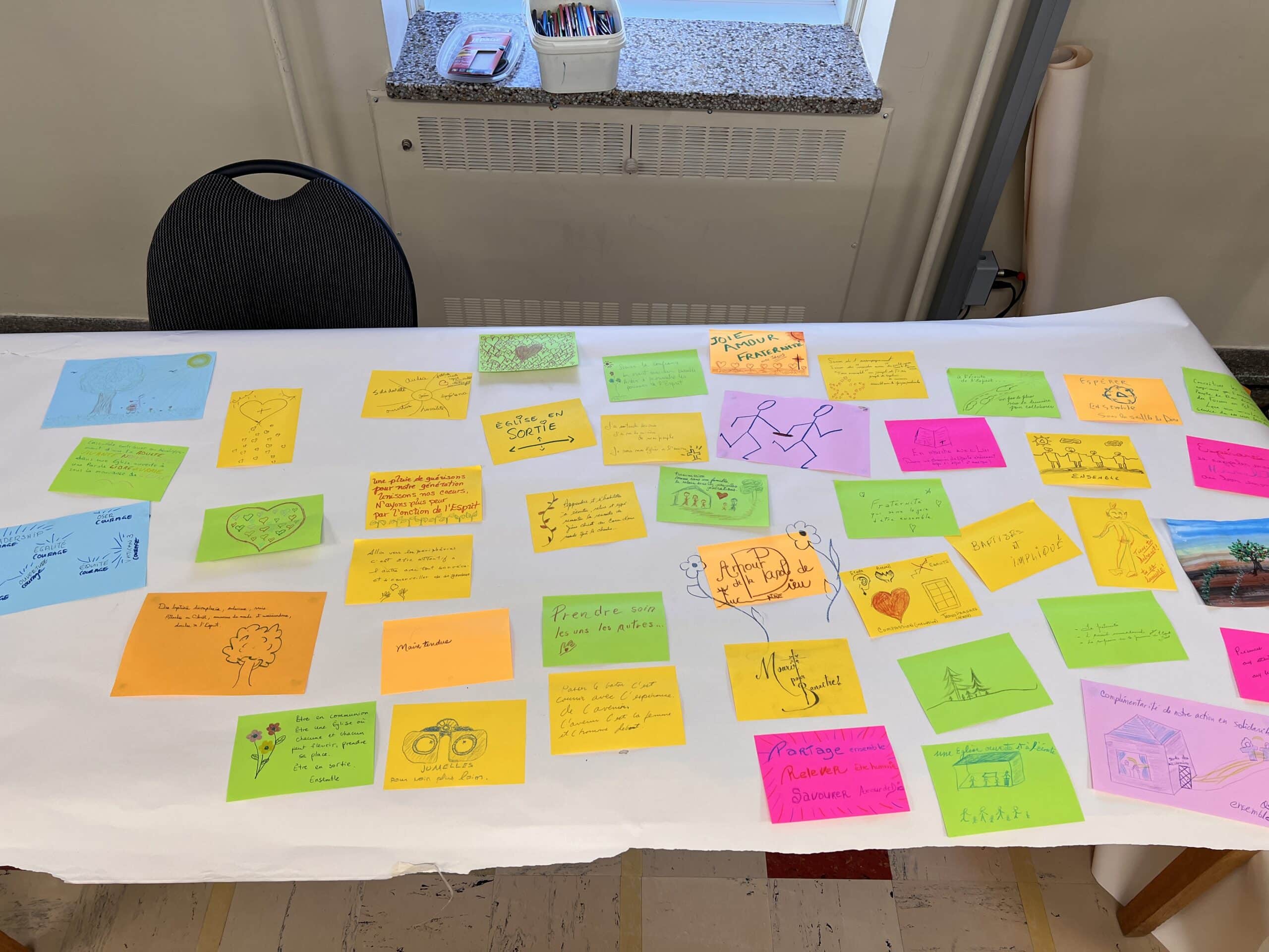 En guise d’envoi, la murale a été déposée sur une table à la sortie de la chapelle et chaque personne pouvait repartir avec la feuille contenant le rêve d’une autre personne.