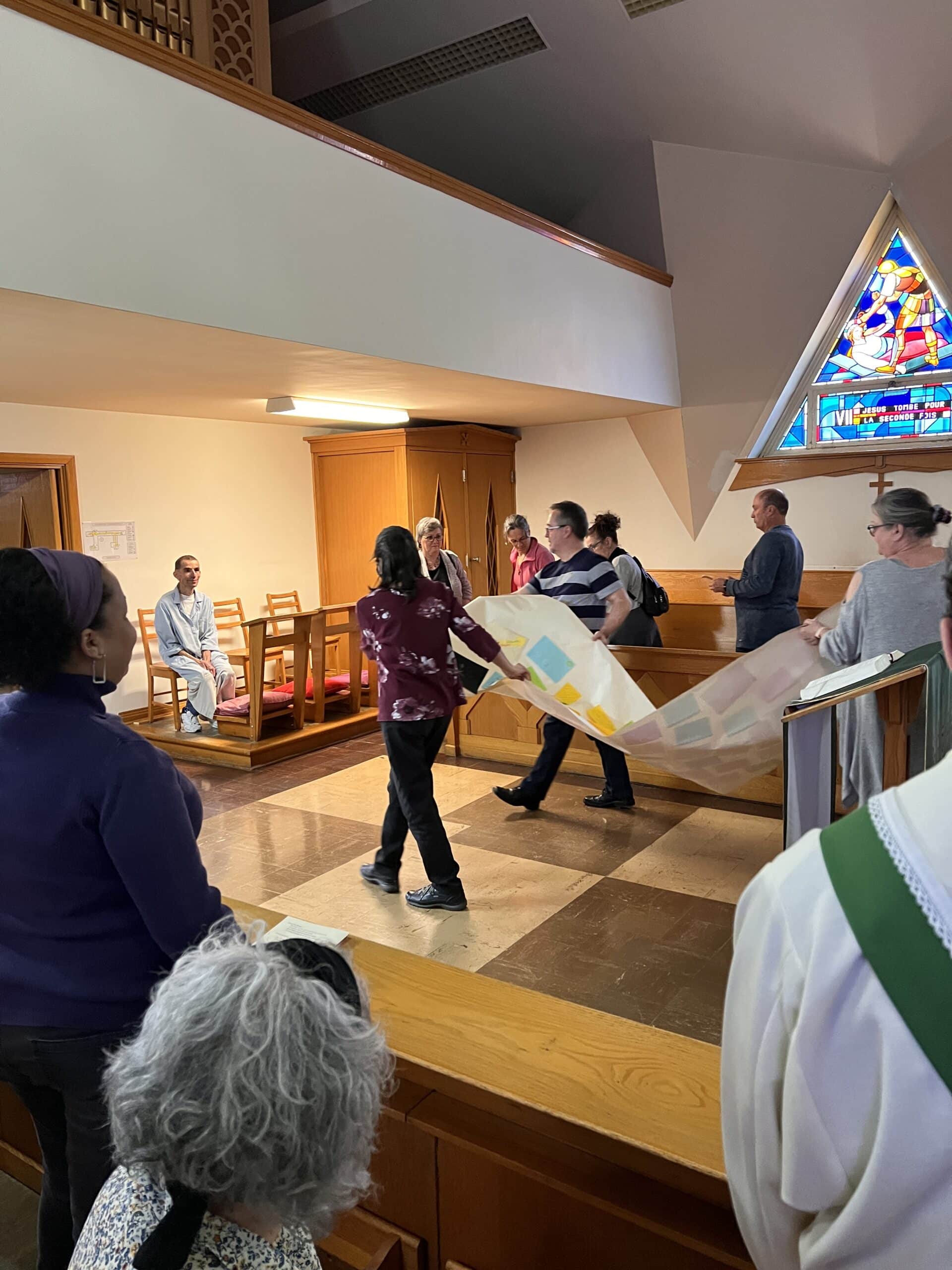 - La banderole des rêves d’Église vers la sortie de la chapelle – elle sera ensuite dépouillée pour laisser un souvenir à chaque participant-e